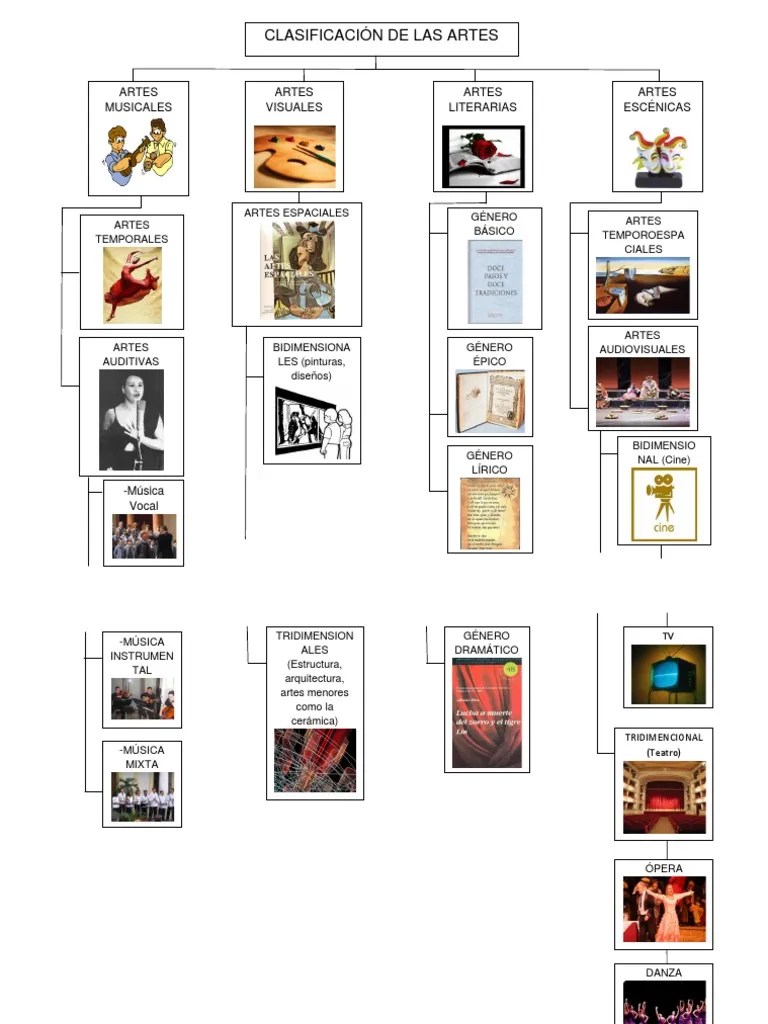 O un espectáculo de ballet, en el que el oído disfruta de la música y la vista del baile.. Dibujo, pintura, gráfica, escultura y arquitectura. En una herramienta didáctica fundamental en el que hacer de cada persona como en el colegio, centro de salud hasta en la vida diaria ya que permite desarrollar la imaginación, creatividad, interés y la motivación por aprender... Artes audiovisuales, escénicas o mixtas:la danza, el teatro y la cinematografía.